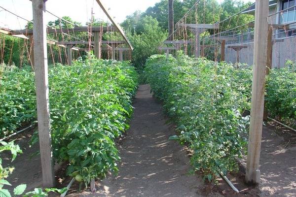 Über einem Gartenbeet werden Gitter mit Tomaten der Sorte Amethyst Jewel aufgestellt - Strukturen, mit denen Sie Tomatenstiele während des Wachstums zusammenbinden können. Normalerweise befindet sich die obere Leiste in einer Höhe von zwei Metern. Unter Gewächshausbedingungen können die Stängel des Amethyst-Juwelen höher als 2 m werden.