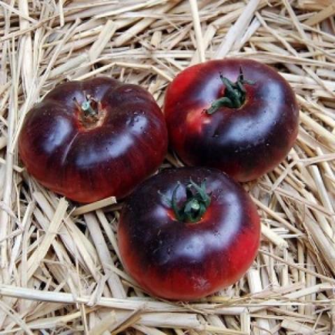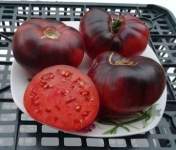 Die Früchte reifen in einer runden, abgeflachten Form und nehmen etwa 150-210 Gramm zu. Die Haut von reifen Amethyst Jewel-Tomaten ist ziemlich fest und nicht anfällig für Risse. Interessanterweise ändert sich die Farbe der Frucht während der Reifung: Tomaten mit technischer Reife haben einen hellvioletten Farbton, und nach der endgültigen Reifung wird der Bereich in der Nähe des Schnitts schwarz und löst sich oben sanft in einer hellen Farbe auf.