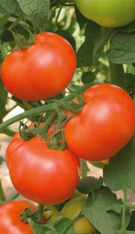 Ein charakteristisches Merkmal reifer Früchte ist die Geschmeidigkeit, sogar die runde Form. Jede Frucht wiegt etwa 125 g. Reife Früchte ziehen mit einem reichen Himbeerfarbton die Aufmerksamkeit auf sich, während die Basis des Stiels dunkelgrün bleibt und dieser Fleck während des Reifungsprozesses verschwindet. Tomaten wachsen normalerweise in der gleichen Größe.