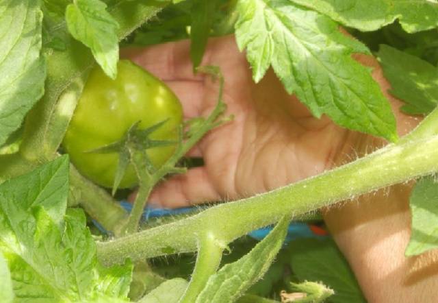 Die Blätter der Tomatensorte Morozko sind groß genug, dunkelgrün. Der Stiel ist leicht belaubt.