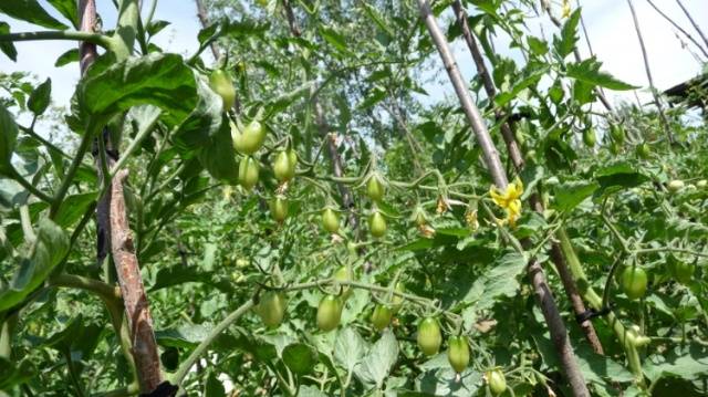 Das Laub ist mittelgroß, die Blattspreiten sind tiefgrün, klein. Legen Sie die erste Blumenquaste auf das 8-9. Blatt. Alle nachfolgenden Blütenstände werden durch zwei oder drei Blätter gebildet. Die Pinsel sind kraftvoll, jeder von ihnen hat bis zu 40 Früchte gebunden.