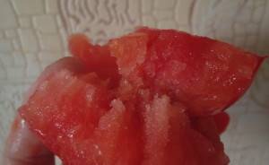 Das Fruchtfleisch ist zuckerhaltig mit vier Samenkammern, die dem Geschmack der Tomate selbst entsprechen. Honig Nachgeschmack. Früchte mit dichter Haut. Sie enthalten 6% Trockenmasse.