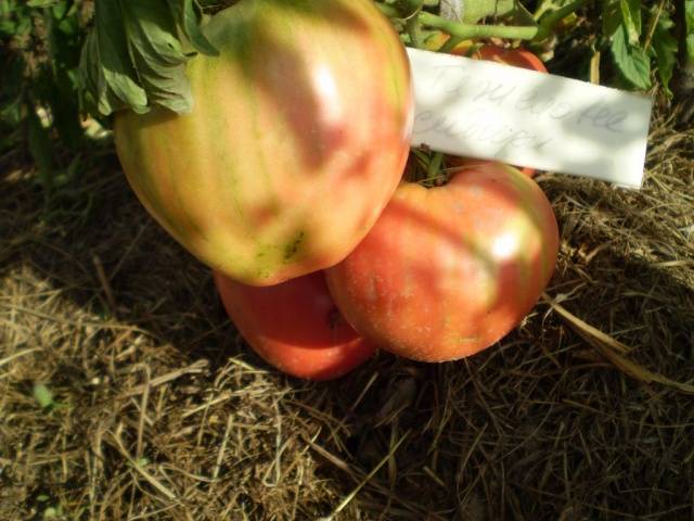 Die Form der Frucht ist bemerkenswert - herzförmig, leicht abgeflacht. Die Farbe der Tomaten ist überwiegend rosa, das Fruchtfleisch ist saftig und fleischig. Die Tomaten schmecken sehr süß mit einer kaum wahrnehmbaren Säure. Die Anzahl der Kameras beträgt nicht mehr als 4-6.