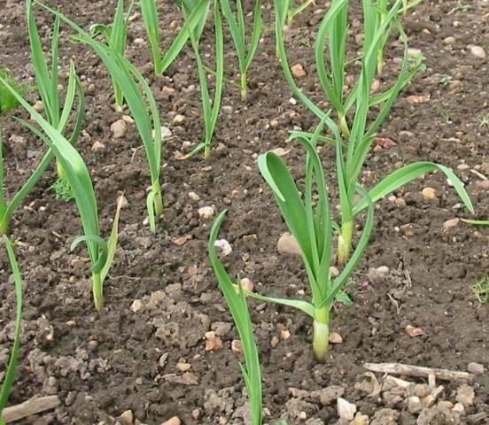 Die erste Düngung erfolgt mit 3-4 Federn. Dies ist eine Zeit intensiven Wachstums. Die wichtigsten Spurenelemente sind Stickstoff und Phosphor, die zur Entwicklung des Wurzelsystems und der grünen Masse beitragen. Für Winterknoblauch ist es notwendig, Magnesiumdünger aufzutragen, sie helfen ihm, besser zu überwintern.