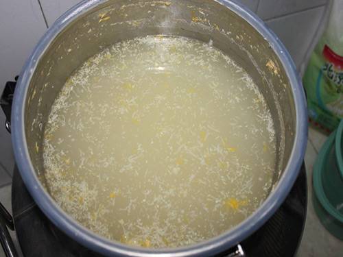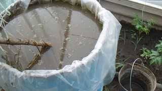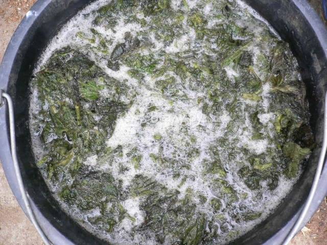 Geschreddertes Gras, das mit Wasser bedeckt ist, sollte fermentieren. Dazu müssen Sie den Behälter mit der Lösung 10-12 Tage offen lassen. Nach der Herstellung sollte die Lösung filtriert und mit Wasser verdünnt werden, bis eine hellbraune Flüssigkeit erhalten wird.