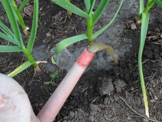Zweite Fütterungszeit - 14 Tage nach dem ersten. Jetzt muss Winterknoblauch mit Phosphor und Kalium gefüttert werden, denn es ist Zeit, dass sich der Kopf bildet. Diese Bestandteile zersetzen sich nicht schnell, daher werden Düngemittel für Winterknoblauch im Voraus in Form einer Lösung ausgebracht.