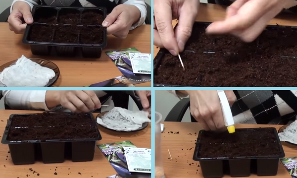 Die Töpfe sind etwa 23 Minuten lang mit einem Substrat gefüllt und mit warmem Wasser bewässert. Die Samen werden auf dem Boden verteilt - drei in jedem Topf. Die Samen werden nicht in den Boden versenkt, sondern mit trockenem und lockerem Boden bestreut - Auberginen brauchen Sauerstoff.