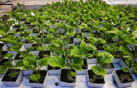 Beleuchtungsvorrichtungen befinden sich in einer Höhe von etwa 50 cm von den Auberginensämlingen. Die Tageslichtstunden dieser Kultur hängen vom Alter der Sämlinge ab: