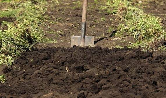 - Wir pflügen oder graben das Territorium. Wir drehen den Boden mit einer Schaufel, brechen die Klumpen. Sie können auch eine Heugabel verwenden. In diesem Fall muss der Boden von großen Wurzeln gereinigt werden. Der gegrabene Bereich kann paarweise belassen werden. Im Sommer wird die Erde in der Regel wieder ausgegraben, wenn Unkraut auftaucht.