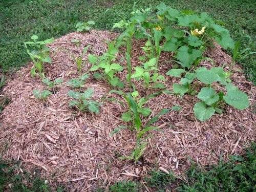 - Legen Sie das geschnittene Unkraut in einer dicken Schicht darauf. Sie können für diese Zwecke Torf, Sägemehl, Stroh, Heu, altes Dachmaterial, Bretter, sogar Pappe und Zeitungen verwenden. Dies geschieht, um den Zugang von Licht zum Unkraut zu verhindern.
