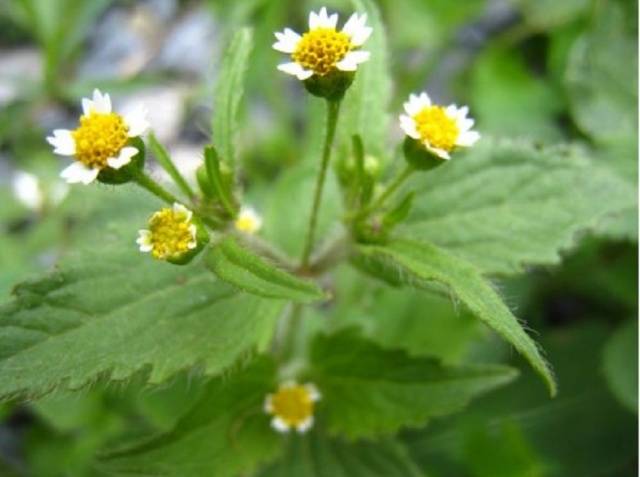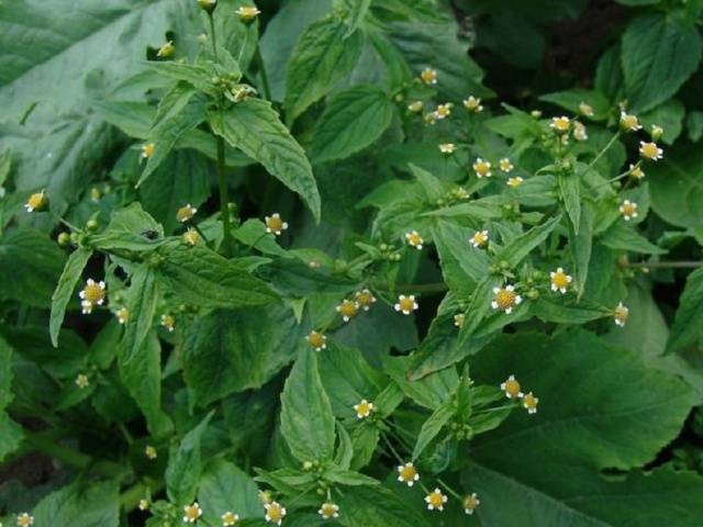 Galisonga ist ein bis zu 70 cm hohes Unkraut mit einem aufrechten Stiel und kleinen weißen Blüten.