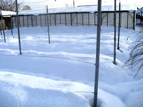 Sie legen niedrige Bögen an und bedecken sie mit einer Folie, die gut gedrückt ist, damit sie nicht vom Wind weggeblasen werden. Der Spalt zwischen Sägemehl und Folie sollte etwa 10 cm betragen, und an den Rändern muss Luft verbleiben . Mit Beginn des Winters wird alles mit Schnee bedeckt sein, und während es keinen starken Frost gibt, strömt Luft in die Lüftungsschlitze und verhindert, dass die Trauben austrocknen. Anstelle von Film können Sie geschnittene Zuckersäcke verwenden.