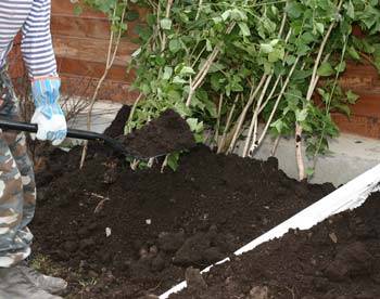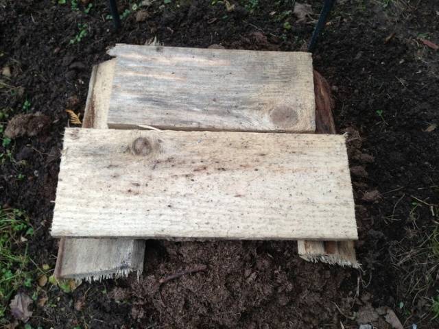 Die dazugehörigen Reben werden auf die unter dem Busch verlegten Bretter gelegt. Sie können Plastikreste verwenden. Hauptsache, der Untergrund ist trocken.