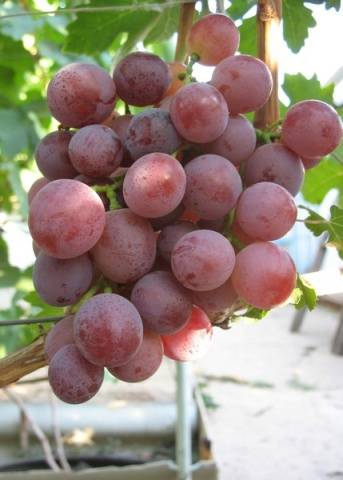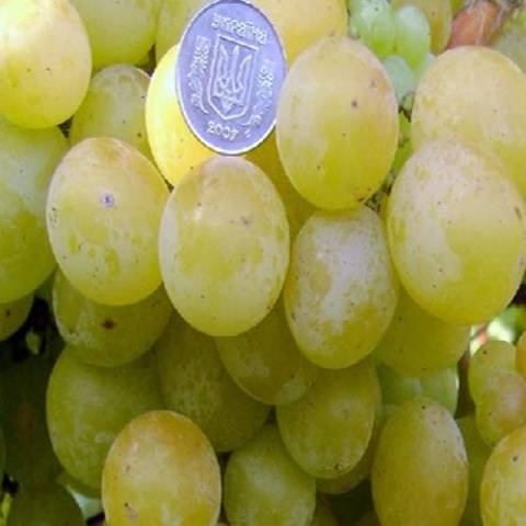 - Die Früchte dieser Rebsorte sind homogen mit süßem Fruchtfleisch. Die Haut ist fest, aber beim Verzehr nicht unangenehm. Aber während des Transports zerknittern die Beeren nicht, sie behalten eine hervorragende Präsentation. In süßen Beeren mit einem zarten Blütenaroma nur 2-3 Samen. Zucker 20-25%, Säuren 4,8-8 g / l. Die Form der Beeren, die bis zu 14 Gramm wiegen, ist rund.