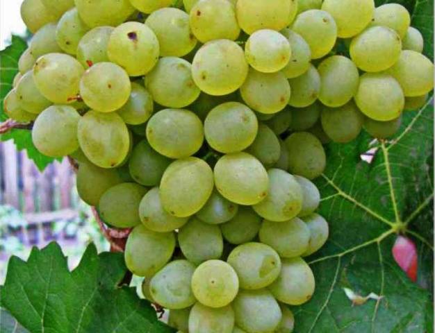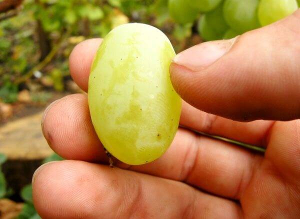 Es ist notwendig, die Büsche zu überwachen und eine Überlastung zu vermeiden: Es gibt nicht mehr als zwei Bürsten auf einem Trieb. - Basierend auf der Beschreibung der Rebsorte sind die Beeren zunächst grün, hellgelb in der technischen Reife, wie auf dem Foto unten.
