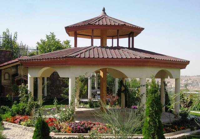 Das Dach für den Pavillon wird mit Ihren eigenen Händen gemacht, nachdem alle genauen Berechnungen durchgeführt wurden. Es gibt spezielle Anforderungen an das Dachmaterial. Neben Zuverlässigkeit und langer Lebensdauer muss das Dach attraktiv sein und mit dem Stil der Struktur selbst kombiniert werden. Es ist gut, wenn das Dach harmonisch in die Landschaftsgestaltung des Hofes passt. Befindet sich der Pavillon in der Nähe eines Wohngebäudes, ist es wünschenswert, dass sich die Gestaltung beider Gebäude überschneidet. Vielleicht sollte das Material für das Dach des Pavillons das gleiche sein, das für die Abdeckung des Wohngebäudes verwendet wurde.