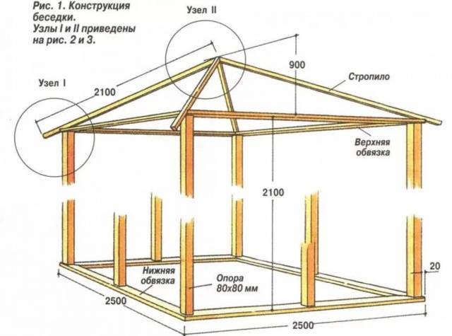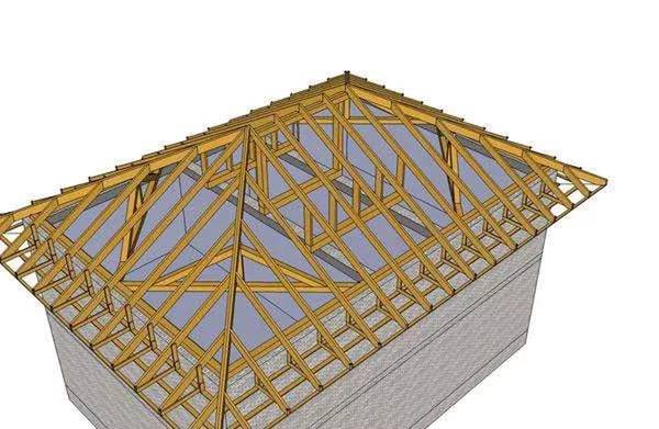 Das Walmdach ist auf quadratischen Pavillons installiert. Die Struktur besteht aus vier schrägen Sparren, die an den Ecken verlegt sind und oben an einer Stelle zusammenlaufen. Es gibt keinen Grat im Walmdach.