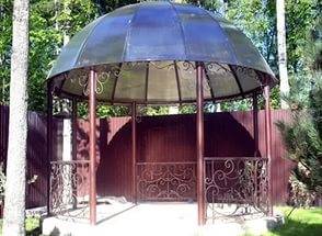 Entsprechend seinen Eigenschaften ist die Metallfliese nicht weit von der Wellpappe entfernt. Im Prinzip ist es ein und dasselbe Material nur mit einer anderen Profilform. Die Metallfliesen auf dem Pavillon sehen vorzeigbarer aus. Dank einer großen Auswahl an Farben und Profilformen ist es möglich, schicke Dächer zu bauen. Der Nachteil des Materials sind die hohen Kosten und die große Abfallmenge bei der Installation auf einem kleinen Dach.