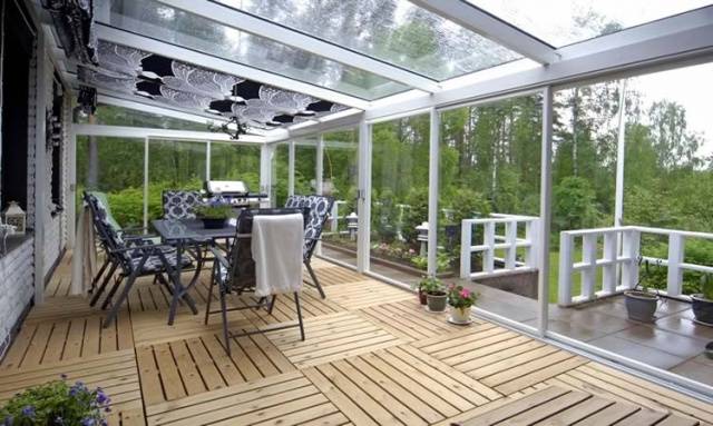 Sie versuchen, die mit dem Haus verbundenen Veranden oder offenen Terrassen auf jede erdenkliche Weise zu adeln. Das Hauptbauelement ist das Dach. Um es abzudecken, wird normalerweise das Dachmaterial gewählt, das auf das Haus gelegt wird. Wenn Sie etwas Ungewöhnliches wollen, wird das Dach der Erweiterung transparent gemacht. Hier wird das gleiche Polycarbonat verwendet. Darüber hinaus können mit diesen transparenten Platten die Terrassen teilweise oder vollständig verglast werden.
