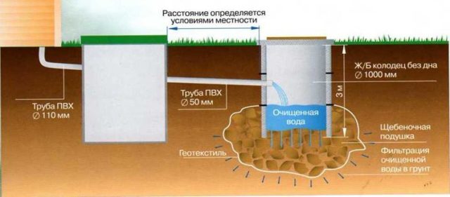 Ein Brunnen mit Filter und Abflussrohr ist nicht der beste. Es unterscheidet sich von der ersten Konstruktion nur durch ein Abflussrohr, durch das gereinigtes Wasser aus der Klärgrube austritt. Schwere Fraktionen setzen sich auf einer Schicht aus Sand und Kies ab. Das System fällt ziemlich schnell aus, so dass es selten ist.