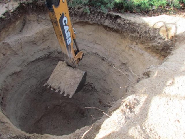 - Graben Sie einen Graben mit dem entsprechenden Durchmesser - 20 cm mehr von den Reifen entfernt. Die Größe der Klärgrube wird durch das Volumen des vorgesehenen Abwassers und dessen Art bestimmt. Wenn eine Option mit einem Sumpf gebaut wird, graben sie in einem bestimmten Winkel 2 Gruben und einen Graben zwischen sich, da die Abflüsse vom Sumpf in die Klärgrube durch die Schwerkraft fließen müssen.
