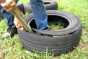 - Der erste Reifen wird auf den Boden gelegt. Auf 4 Seiten des Reifens werden Holzstangen mit einer Länge eingetrieben, die der Höhe des Bohrlochs entspricht. Dies verhindert ein Abdriften der Reifen. Beim Verlegen zwischen Stangen und Reifen werden zusätzlich Gummistücke verlegt. Die folgenden Elemente sind gestapelt. Sie werden mit Gummikleber zusammengehalten.