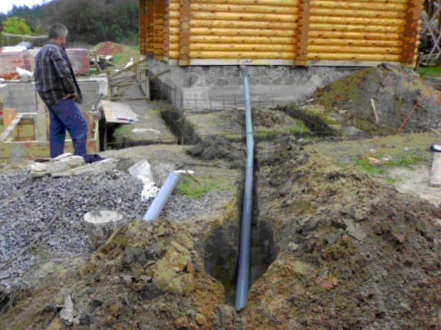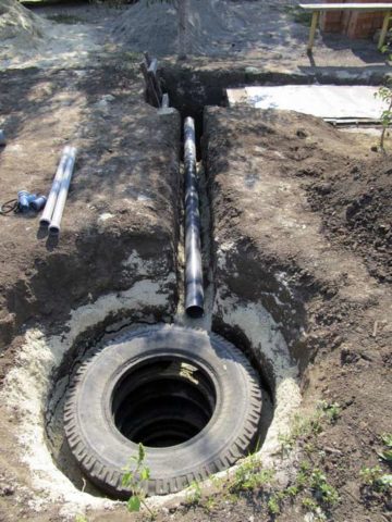 - Ein Graben wird vom Haus zur Klärgrube gegraben, um das Abwasserrohr zu verlegen. Sie führten sie in einen Reifenbrunnen im oberen Drittel. Die Installation erfolgt schräg, da die Abflüsse durch Schwerkraft in die Klärgrube gelangen.