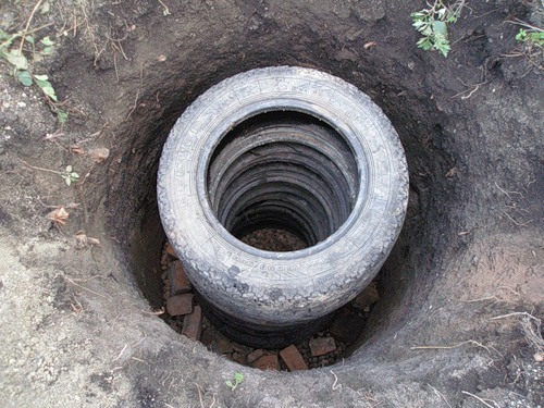 Klärgrube. Ein Analogon einer Senkgrube, in der sich Abflüsse ansammeln und dann abgepumpt werden. Die Option mit Reifen kostet deutlich weniger als eine Betonkonstruktion, ist ihr jedoch in Bezug auf die Haltbarkeit unterlegen. Die korrekte und gleichmäßige Form der Reifen als Bestandteile erleichtert jedoch die Montage erheblich.Darüber hinaus können Sie von den Reifen das gesamte Abwassersystem des Sommerhauses - seinen äußeren Teil - sammeln.