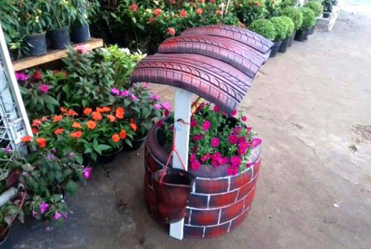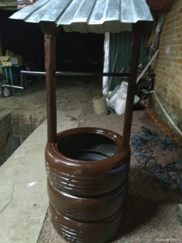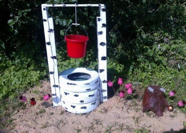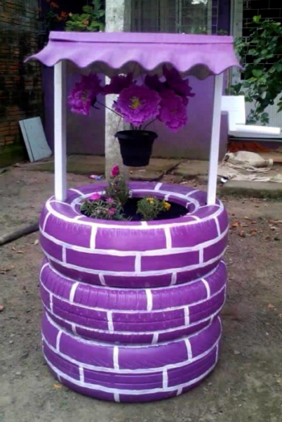 Ein dekorativer Brunnen aus Reifen ist eine Nachahmung einer realen Struktur, die mit Erde gefüllt ist. Tatsächlich ist dies die Form eines Blumengartens aus Reifen, jedoch mit zusätzlichen dekorativen Elementen wie Stützen, mit Nachahmung eines Schafts und eines Baldachins.