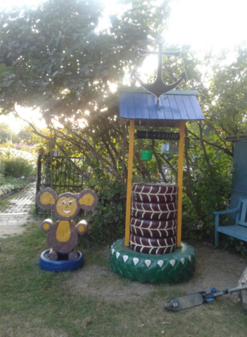 Nützliche Strukturen - ein Abwasser- oder Entwässerungsbrunnen - sind äußerlich unansehnlich und normalerweise maskiert. Das Design eines dekorativen Reifens aus Reifen mit eigenen Händen kann sehr unterschiedlich sein.
