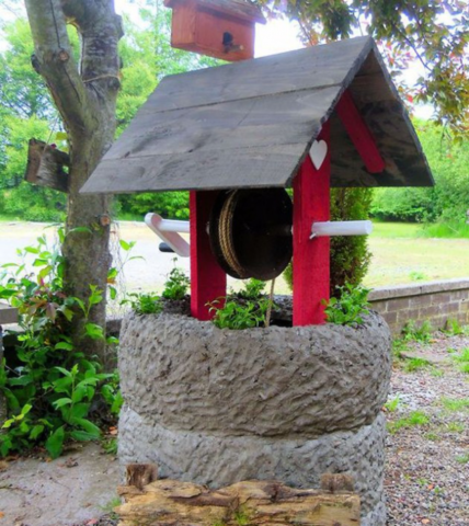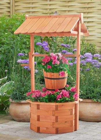 Sie können den Brunnen mit Erde füllen und Blumen oder sogar Beeren wie Erdbeeren darin pflanzen. Manchmal wird die Struktur als Sommerspielplatz für Zimmerpflanzen genutzt: Sie nehmen die Töpfe heraus und stellen sie auf eine geschlossene Luke. Sie können einen Blumentopf an einen Brunnen "Schaft" hängen - das sieht auch attraktiv aus.