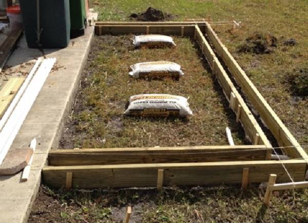 Die Markierung erfolgt mit Pfählen und einer Schnur. Eine Erdschicht wird bis zu einer Tiefe von etwa 35 cm von der Oberfläche entfernt. Eine Schicht aus Schotter und Sand mit einer Dicke von etwa 10 bis 15 cm wird eingefüllt und gerammt. Die Schalung besteht aus den Brettern rund um den Umfang. Auf das Sand- und Kieskissen wird ein Verstärkungsnetz gelegt. Von oben wird die Struktur mit Beton (Klasse M200) gegossen. Nach zwei Wochen Trocknen können Sie mit der Installation der Wände des Hühnerstalles beginnen.
