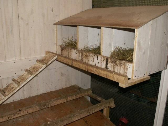 Damit Hühner Eier bequem tragen können, sollten sie hochwertige Nester ausrüsten. Für 15 Hühner werden ungefähr 4-5 Nester benötigt. Ihr Design kann entweder offen oder geschlossen sein. Wenn Sie einen Hühnerstall im Winter bauen, ist es besser, geschlossene Nester zu wählen. Für sie können Sie vorgefertigte Holzkisten verwenden, deren Höhe 40 cm beträgt. Die Breite und Tiefe sollte etwa 30 cm betragen. Stroh wird am Boden des Nestes gelegt.