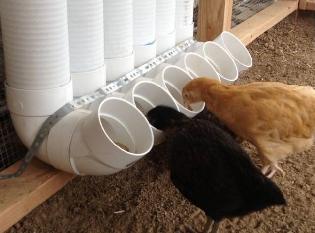 Damit die Hühner frei Wasser essen und trinken können, ist es erforderlich, den Standort der Futtertröge und Trinker auf dem erforderlichen Niveau anzugeben. Normalerweise befinden sie sich gegenüber den Sitzstangen an der gegenüberliegenden Wand. Die Anzahl und Größe des Futter- und Trinkers hängt von der Anzahl der Hühner ab. Für ein angenehmes Essen und Trinken sollten für jedes Huhn ca. 15 cm Futtermittel und Trinker bereitgestellt werden.