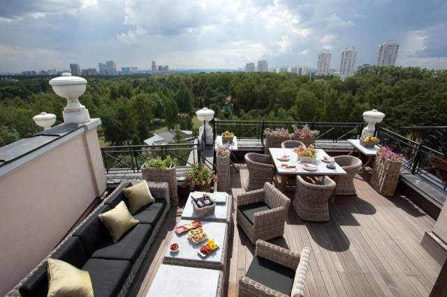 Die Terrasse selbst ist eine einfache Struktur, aber ihre Lage auf dem Dach erschwert das Design erheblich. Ein seriöser Ansatz zur Vorbereitung des Projekts ist erforderlich. Sie müssen alles berücksichtigen: ein solides und wasserdichtes Dach unter der Terrasse, die Anordnung der Zäune, das Design und viele andere wichtige Aspekte.