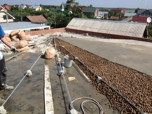 - Die letzte Schicht ist wieder wasserdicht. Auf dem Dach ist ein Teppich angeordnet, der aus einer Mischung von Bitumenmastix mit Kies besteht.Als sauberer Boden dienen Stahlbetonplatten mit einer Größe von 40 x 44 cm, die mit Keramikfliesen mit gewellter Oberfläche ausgekleidet sind. Anstelle von Platten kann der Boden mit Terrassendielen bedeckt werden.