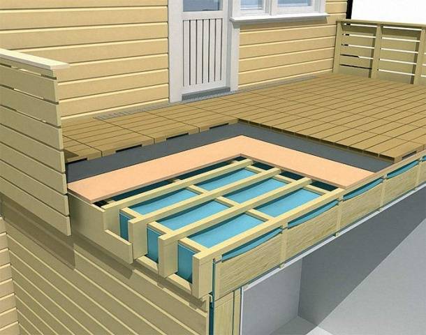 Das größte Problem bei der Anordnung der Terrasse ist der Boden, da er auch als Dach des untergeordneten Gebäudes dient. Bei unsachgemäßer Ausführung besteht die Gefahr von Überschwemmungen bei Regen oder Schneeschmelze.