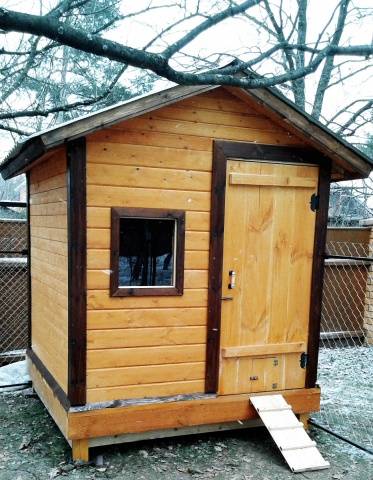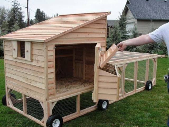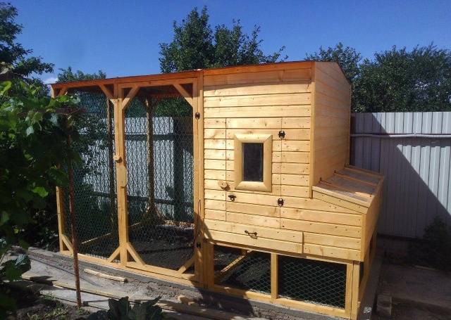 Eine interessante Option ist der Schild-Hühnerstall, dessen Wände aus OSB-Platten oder Brettern bestehen. Ein solches Gebäude ist schnell montiert und dient für eine lange Zeit.