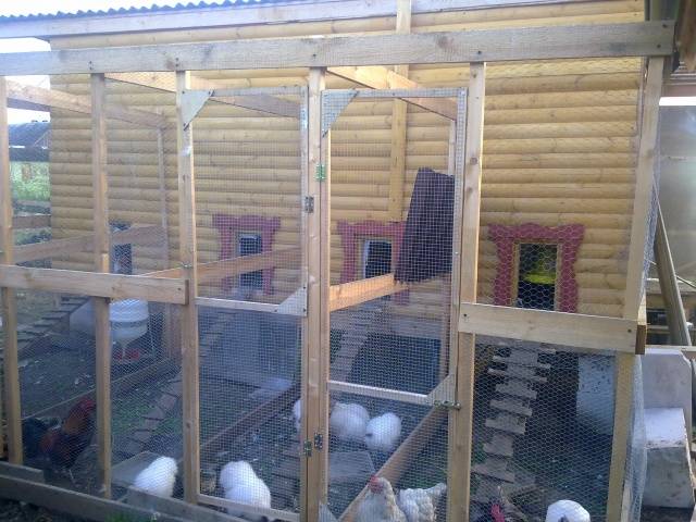 Die bequemste Option ist ein Hühnerstall in der Bar. Es wird nur Nadelholz verwendet, jedoch mit dem richtigen Feuchtigkeitsgehalt. Das Holz sollte nicht vollständig trocken sein, da es noch mehr austrocknet und sich verformt, wodurch Risse entstehen.