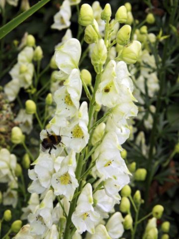 - In wilden Exemplaren von Aconitum haben sie eine unregelmäßige Form in Form eines Helms, breit. Hummeln sind der einzige Bestäuber der Art, so dass die Größe der Aconitumblüte leicht ein ziemlich großes Insekt aufnehmen kann.