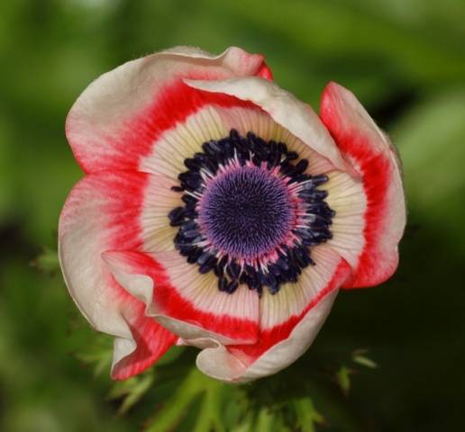 Leuchtend rote Anemone mit schwarzen Staubblättern und einem schmalen schneeweißen Streifen in der Mitte. Aus der Ferne oder mit unvollständiger Öffnung der Knospe kann diese Anemone mit Mohn verwechselt werden. Busch 15-30 cm hoch mit präparierten Blättern, die gegen Krankheiten resistent sind. Anemone Holland de Caen sieht gut aus auf einem Blumenbeet, in einer großen Auswahl gepflanzt oder beim Erstellen von Blumensträußen.