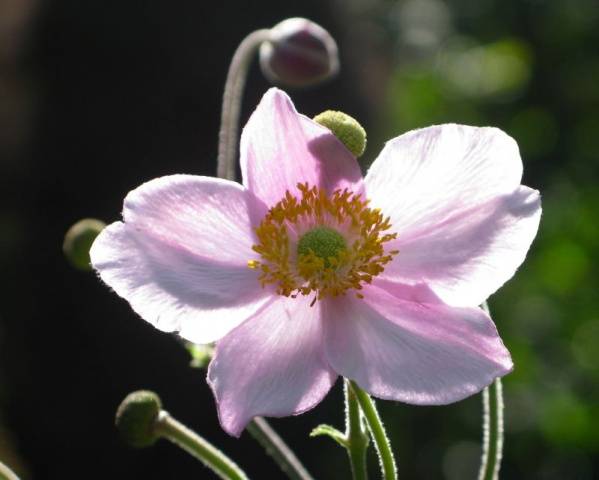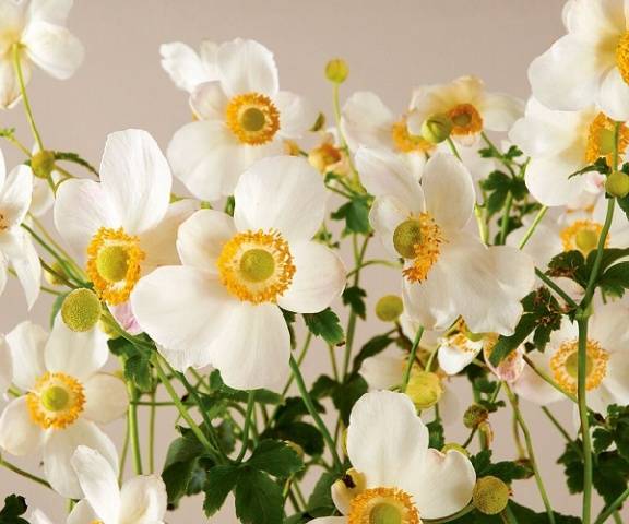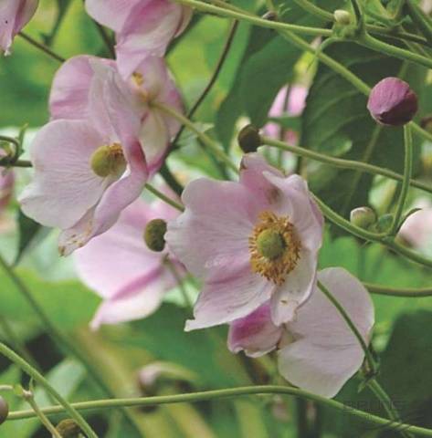 Einfache Blüten von Anemonen werden in Gruppen an den Enden von verzweigten Stielen gesammelt, unter natürlichen Bedingungen sind sie weiß oder blassrosa gefärbt. Die Knospen öffnen sich im Frühherbst. Sortenanemonen haben Blüten von helleren Farben, sie können halbgefüllt sein.