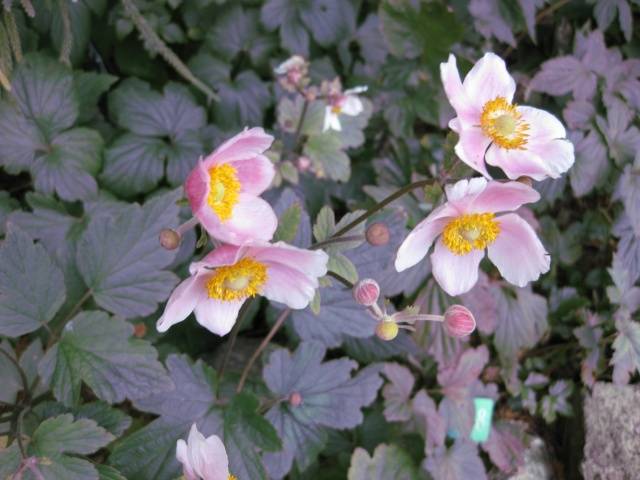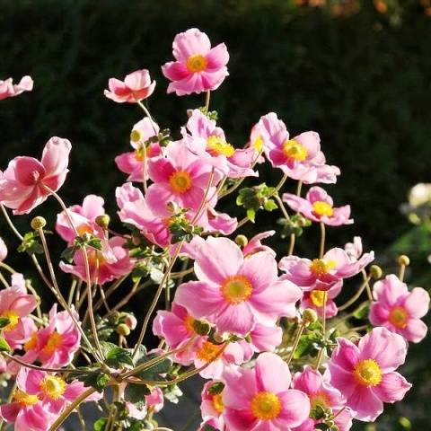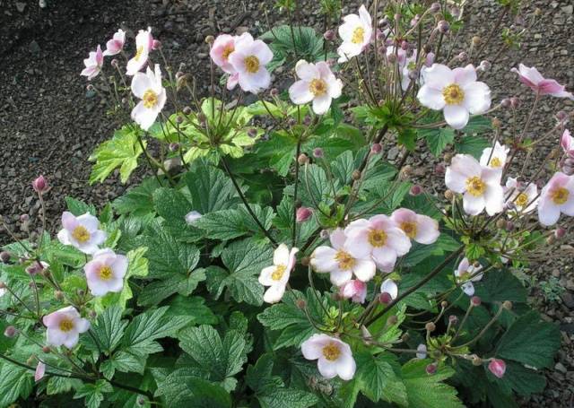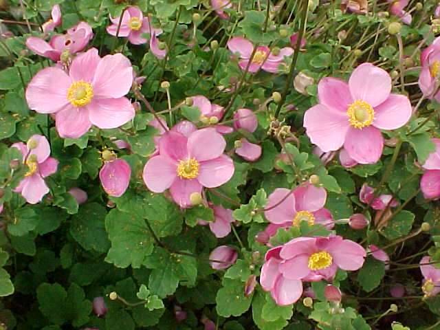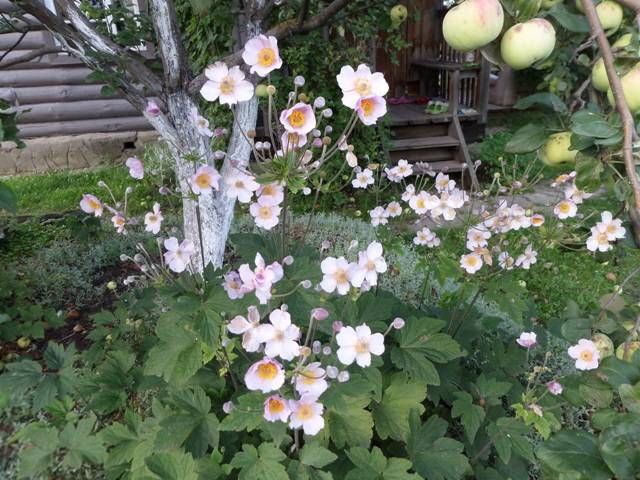 Im Gegensatz zu den vorherigen Arten wächst es bis zu anderthalb Meter, seine Blüten sind kleiner und die großen Blätter sind dunkelgrün. Die Anemone blüht im Spätsommer oder Frühherbst, weiß oder rosa gestrichen. Die Sorten dieser Anemonen wurden so kreiert, dass die Büsche verkümmert und besser für den Hausgarten geeignet waren.