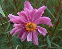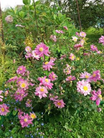 Eine mehrjährige Pflanze erreicht eine Höhe von 60-80 cm. Sehr schöne sezierte Blätter werden in einer Basalrosette gesammelt. Ihre Farbe ist dunkelgrün. Die Blume selbst hat eine kleine Locke von Blättern auf einem stabilen Stiel. Der Stiel selbst ist groß und trägt eine schalenförmige halbgefüllte Blüte mit 20 Blütenblättern. Sie können einzeln oder in kleinen umbellierten Blütenständen gesammelt werden. Die Farbe der Blumen in der Prince Henry Anemone ist sehr hell, die meisten Züchter halten sie für ein tiefes Rosa, aber einige sehen sie in Kirsch- und Purpurtönen. Prinz Henry gehört zu den herbstblühenden Anemonen. Die bezaubernden Blüten sind Ende August zu sehen und blühen bis zu 6 Wochen. Auf diesem Foto sind überwachsene Anemonen zu sehen.