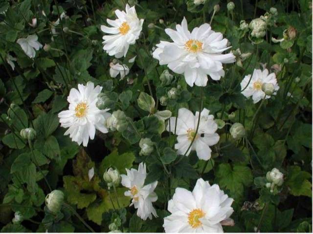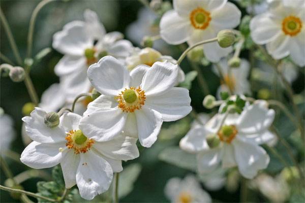 Die japanische Anemone Honorine Jobert wird oft unter dem Namen Honorine Jobert verkauft. Seine Höhe beträgt ca. 80 cm, große, zerlegte Blätter sind graugrün. Die Blüten der Anemonen sind einfach, schneeweiß mit gelben Staubblättern.