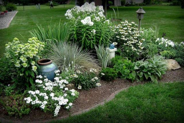 - Es ist überhaupt nicht notwendig, das gesamte Gartengrundstück in Weiß zu gestalten. Es wird ausreichen, das Erholungsgebiet, das Gebiet in der Nähe des Stausees, mit weißen Blumen hervorzuheben.