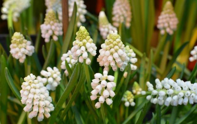 Muscari Alba haben weiße Blüten, mögen kein stehendes Wasser, pflanzen Staudenböden, die Wasser und Luft gut durchlassen. Muscari wachsen mit gleichem Erfolg an sonnigen Orten und im Schatten. Sie sind sehr unprätentiös, wachsen schnell. Weiße Blüten sehen spektakulär aus, wenn sie in großen Mengen gepflanzt werden. Sie erfordern keine zusätzliche Aufmerksamkeit für sich selbst, sie können 5 Jahre lang an einem Ort wachsen.