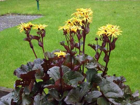 Buzulnik Othello kann auch auf schwerem Lehmboden ohne Entwässerung wachsen und verträgt problemlos vorübergehende Überschwemmungen