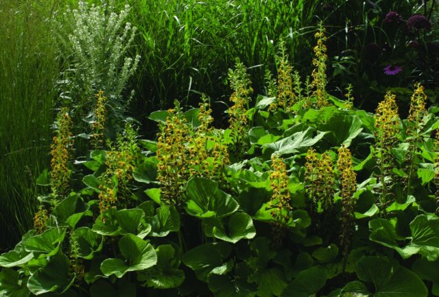 Buzulnik Vich sieht auch in Gruppenpflanzungen spektakulär aus. Es kann mit einer Vielzahl von Grün- und Blütenpflanzen kombiniert werden. Für eine harmonische Form der Blütenstände können die Nachbarn sein: Ährchen Veronica, Weidenbrot, Lupine, Fenchelrost (Fenchel), Fingerhut und siebenbürgischer Salbei.