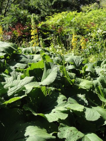 - Grundblätter bis 30-40 cm Länge und 35 cm Breite, herzförmig, Kanten mit scharfen Zähnen, charakteristische Elastizität und Glanz;
